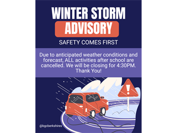 Due to weather conditions and forecast, we will be closing early today at 4:30 PM. All activities and programs scheduled after 4:30 PM are canceled.